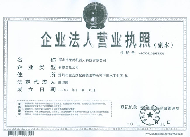 今天,全體榮德人見(jiàn)證了榮德發(fā)展歷史上重要的一刻:本公司由“深圳市榮德機(jī)械設(shè)備有限公司”正式更名為“深圳市榮德機(jī)器人科技有限公司”,注冊(cè)資本660萬(wàn)元。