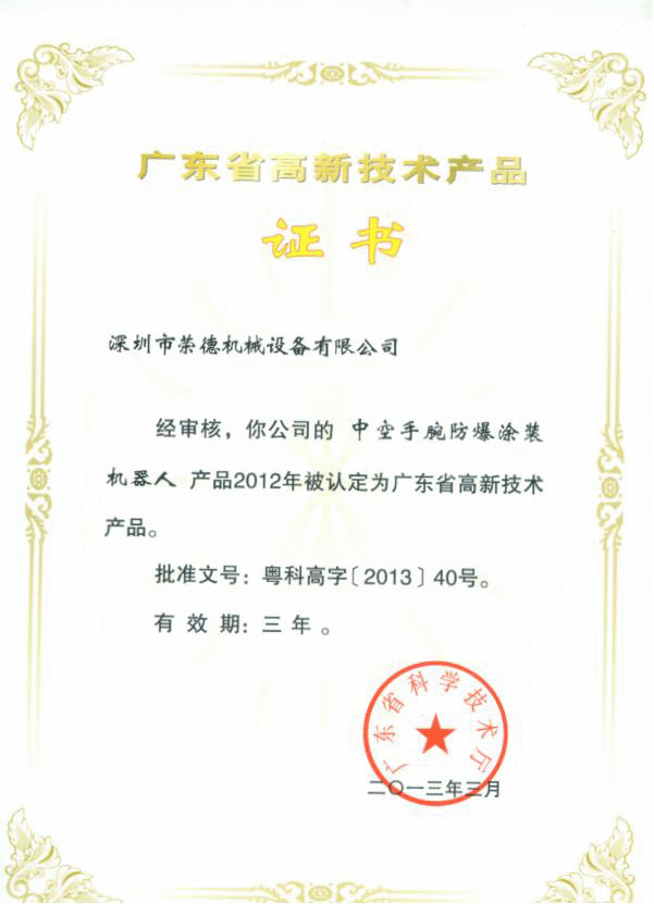日前,廣東省科技廳公示了獲得“2012年廣東省高新技術產品證書”的企業(yè),深圳市榮德機器人科技自主研發(fā)的噴涂機器人赫然在目。
