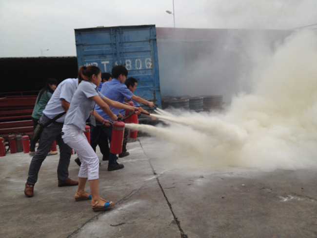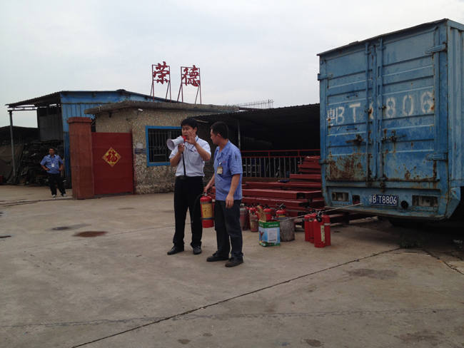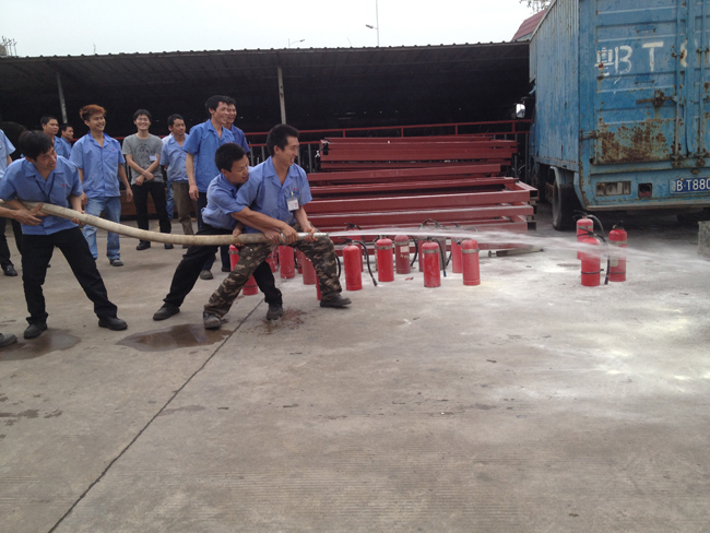 2、消防知識(shí)培訓(xùn)。等大家集中到了廠外安全區(qū)域后,由義務(wù)消防隊(duì)人員對(duì)全員進(jìn)行滅火器材的使用方法。主要是干粉滅火器和消防栓的使用。安全主任謝京亮邊講解邊模擬使用傳授給所有員工滅火器的使用步驟:搖一搖、拔下插銷、瞄準(zhǔn)火焰根部、壓下把手、來(lái)回掃射。