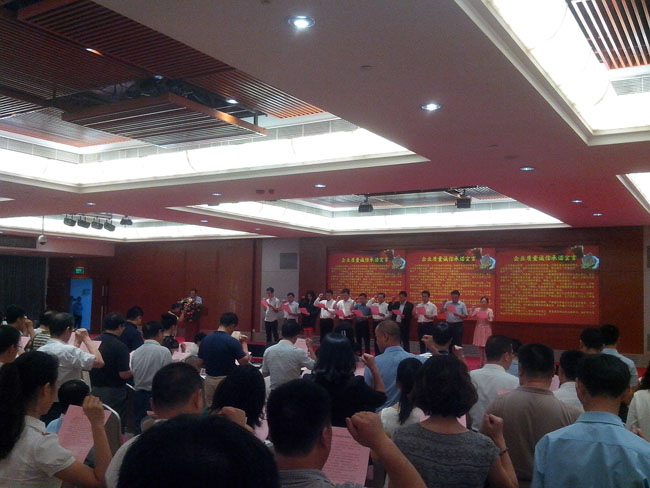 大會的高潮部分是所有與會的企業(yè)代表與政界代表一起舉起右手,宣讀《企業(yè)質(zhì)量誠信承諾書》:為構(gòu)建誠信經(jīng)營、公平競爭的市場環(huán)境,加強(qiáng)質(zhì)量誠信體系建設(shè),切實(shí)保證產(chǎn)品質(zhì)量,維護(hù)消費(fèi)者的合法權(quán)益,推動建設(shè)“質(zhì)量強(qiáng)國”,促進(jìn)“質(zhì)量強(qiáng)市”、“質(zhì)量惠民”。本企業(yè)向社會鄭重承諾:一、牢固樹立“質(zhì)量第一”的思想,不斷增強(qiáng)質(zhì)量意識和社會責(zé)任意識,保證和提高產(chǎn)品質(zhì)量,落實(shí)企業(yè)質(zhì)量主體責(zé)任,滿足人們?nèi)罕妼Ω哔|(zhì)量產(chǎn)品的期待和需求,增強(qiáng)人民群眾的消費(fèi)信心。二、嚴(yán)格遵守《產(chǎn)品質(zhì)量法》、《標(biāo)準(zhǔn)化法》、《計(jì)量法》等法律法規(guī),嚴(yán)格執(zhí)行產(chǎn)品標(biāo)準(zhǔn),不制假、不售假,杜絕虛假宣傳,堅(jiān)決抵制假冒偽劣、欺詐消費(fèi)者等失信違法行為,不侵害其他企業(yè)合法權(quán)益。三、加強(qiáng)全員、全過程、全方位的質(zhì)量管理,推行先進(jìn)質(zhì)量管理方法,完善計(jì)量保證體系、標(biāo)準(zhǔn)化體系和質(zhì)量保證體系,嚴(yán)格原材料,生產(chǎn)過程、產(chǎn)品出廠和儲運(yùn)銷售全過程的照顧質(zhì)量控制。四、建立質(zhì)量安全事故主動報(bào)告制度,嚴(yán)格落實(shí)質(zhì)量安全責(zé)任追究制度,完善產(chǎn)品質(zhì)量追溯體系,及時(shí)解決消費(fèi)者的質(zhì)量投訴,自覺履行產(chǎn)品質(zhì)量召回、“三包”等產(chǎn)品質(zhì)量責(zé)任和義務(wù)。本單位嚴(yán)格履行以上承諾。如有違反,愿意承擔(dān)相應(yīng)的法律責(zé)任,接受將失信違法行為納入不良信用記錄并向社會公開。二0一四年九月五日