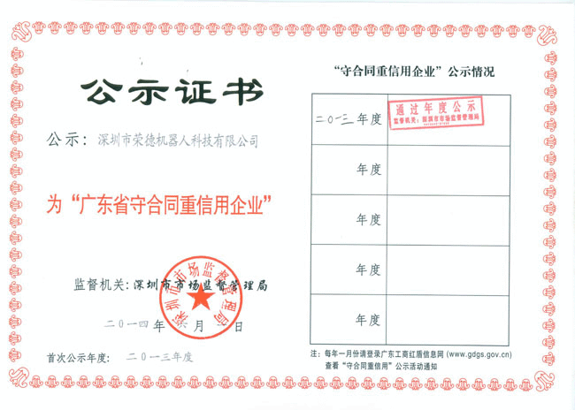 在此之際,非常感謝廣大客戶朋友對公司的認(rèn)可和滿意,只有客戶對公司的認(rèn)可,這樣公司合同才能夠嚴(yán)格履行,最終才能獲得該榮譽(yù)稱號。全體榮德人將會以此為契機(jī),將產(chǎn)品質(zhì)量和服務(wù)做到行業(yè)內(nèi)一流水平,滿足并不斷超越客戶需求。同時(shí)也請客戶放心選購我司的噴涂機(jī)器人、自動噴涂設(shè)備、自動化生產(chǎn)線,獲得“廣東省名牌產(chǎn)品”的“守重企業(yè)”值得您的信賴,我們將會以最優(yōu)質(zhì)的質(zhì)量回報(bào)客戶、回報(bào)社會,為深圳質(zhì)量的發(fā)展乃至全國質(zhì)量的發(fā)展貢獻(xiàn)自己的力量!